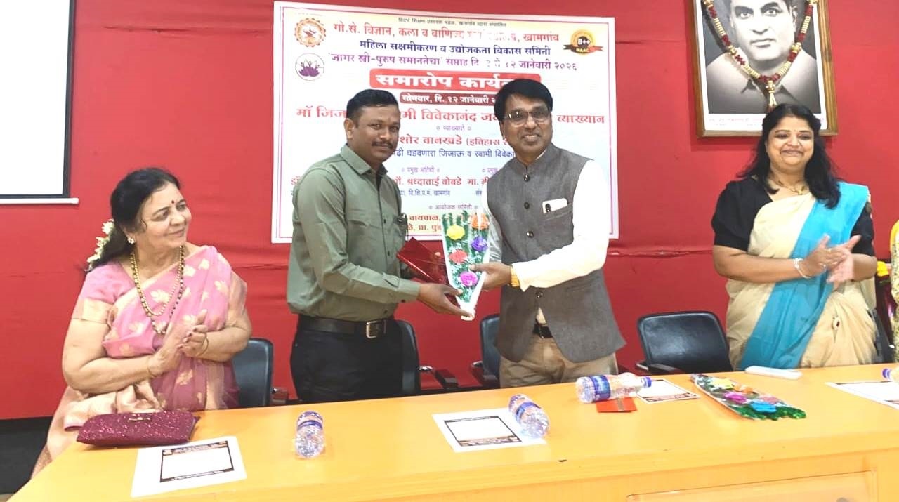 खामगाव : विदर्भ शिक्षण प्रसारक मंडळ, खामगाव संचलित गो. से. विज्ञान, कला व वाणिज्य महाविद्यालय, खामगाव येथील महिला सक्षमीकरण व उद्योजकता विकास समितीच्या वतीने आयोजित “जागर स्त्री–पुरुष समानतेचा सप्ताह” (दिनांक ३ ते १२ जानेवारी २०२६) या विशेष सप्ताहाचा समारोप कार्यक्रम दिनांक १२ जानेवारी २०२६ रोजी उत्साहात पार पडला. या समारोपीय कार्यक्रमात माँ जिजाऊ जयंती व स्वामी विवेकानंद जयंती साजरी करण्यात आली. या समारोपीय कार्यक्रमाच्या अध्यक्षस्थानी प्राचार्य डॉ. डी. एस. तळवणकर हे होते. प्रमुख पाहुणे म्हणून मा. सौ. श्रद्धाताई प्रशांत बोबडे (सदस्या, विदर्भ शिक्षण प्रसारक मंडळ, खामगाव) तसेच मा. नीताताई बोबडे (संस्थापिका, निसर्ग संस्था, खामगाव) उपस्थित होत्या. प्रमुख वक्ते म्हणून डॉ. किशोर वानखडे (इतिहास संशोधक) यांनी मार्गदर्शन केले. या विशेष सप्ताहांतर्गत सावित्रीबाई फुले जयंती, निबंध स्पर्धा, स्वसंरक्षण प्रशिक्षण वर्ग, पथनाट्य, उद्योजकता मार्गदर्शन, पतंगोत्सव, शिवणकला व फॅशन डिझायनिंग प्रशिक्षण वर्ग, तसेच माँ जिजाऊ जयंती व स्वामी विवेकानंद जयंती अशा विविध उपक्रमांचे आयोजन करण्यात आले. या सर्व उपक्रमांद्वारे विद्यार्थ्यांमध्ये समानता, स्वावलंबन, नेतृत्वगुण आणि सामाजिक जाणीव वृद्धिंगत करण्याचा प्रयत्न करण्यात आला. समारोपीय कार्यक्रमाची सुरुवात माँ जिजाऊ, क्रांतीज्योती सावित्रीबाई फुले व स्वामी विवेकानंद यांच्या प्रतिमांचे पूजन व दीपप्रज्वलन करून झाली. दिनांक १२ जानेवारी २०२६ रोजी जयंतीनिमित्त आयोजित विशेष व्याख्यानात “सशक्त युवा पिढी घडवणारा जिजाऊ व विवेकानंदांचा दृष्टिकोन” या विषयावर डॉ. किशोर वानखडे यांनी विद्यार्थ्यांना माँ जिजाऊ व स्वामी विवेकानंद यांच्या विचार–कृतींचे सखोल विवेचन केले. या विचारांच्या आधारे आजचा युवक मूल्याधिष्ठित, कर्तव्यनिष्ठ व राष्ट्रनिर्मितीसाठी सज्ज कसा घडू शकतो, याबाबत त्यांनी प्रेरणादायी मार्गदर्शन केले. प्रमुख पाहुण्या मा. सौ. श्रद्धाताई प्रशांत बोबडे यांनी आपल्या मनोगतात विद्यार्थ्यांनी कृतिशील, प्रयत्नशील व संवेदनशील नागरिक बनावे, स्त्री–पुरुष समानतेचा विचार केवळ संकल्पनेपुरता न ठेवता प्रत्यक्ष कृतीत उतरवावा, तसेच शिक्षणाबरोबरच सामाजिक जबाबदारीची जाणीव ठेवावी, असा संदेश दिला. त्यांच्या मते, अशा उपक्रमांमुळे विद्यार्थ्यांमध्ये नेतृत्वगुण विकसित होऊन समाजपरिवर्तनाची सकारात्मक दिशा निश्चित होते. तसेच प्रमुख पाहुण्या मा. नीताताई बोबडे यांनी विद्यार्थ्यांना उद्योगशील, स्वावलंबी व नवोपक्रमशील होण्याचे आवाहन केले. उपलब्ध संसाधनांचा योग्य वापर करून स्वतःची क्षमता ओळखावी व समाजोपयोगी उपक्रमांतू